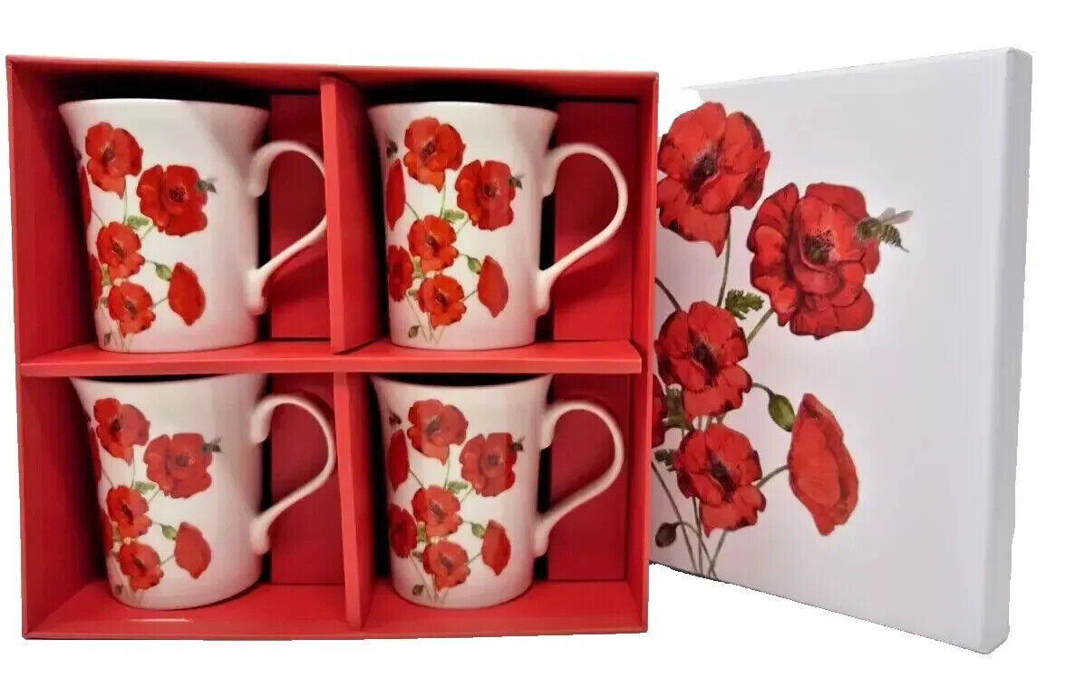 4 Red Poppy & Bees Coffee Tea Mugs Set Gift Boxed Leonardo Collection ideal Gift