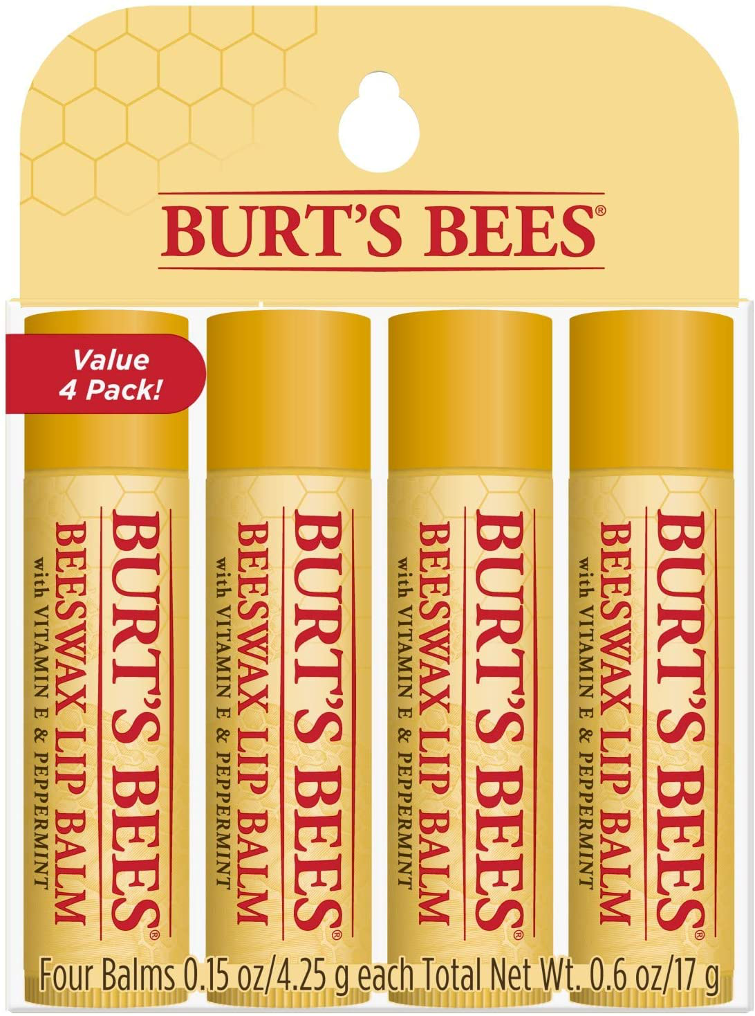 Burt's Bees Lip Balm Multipack, Moisturising Lip Balm Set With Beeswax & Honey, Value Pack, 4x4.25g