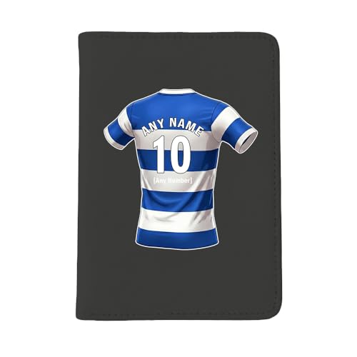 UNIGIFT Personalised Gift - Shepherds Bush Fan Black Passport Holder Cover (Blue and White Hoop Football Jersey Design) Custom Name Message - London W12 Club