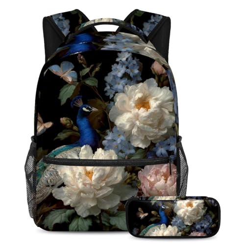 VAPOKF Peocock on Blossom Peony Butterfly School Bag Set for Teen Girls Boys Kids, Student Bookbag Backpack Rucksack with Pencil Case for Primary Secondary Junior High School