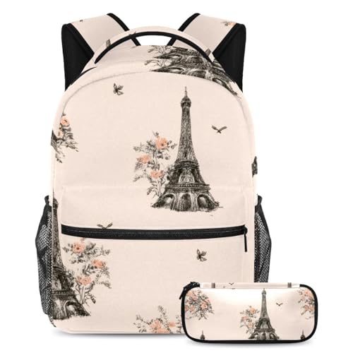 VAPOKF Paris Tower Blossom Flowers Butterfly School Bag Set for Teen Girls Boys Kids, Student Bookbag Backpack Rucksack with Pencil Case for Primary Secondary Junior High School
