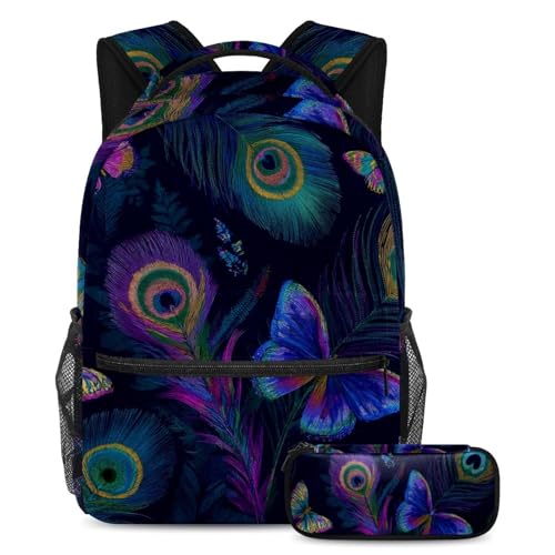 VAPOKF Peacock Feathers Colorful Butterfly School Bag Set for Teen Girls Boys Kids, Student Bookbag Backpack Rucksack with Pencil Case for Primary Secondary Junior High School