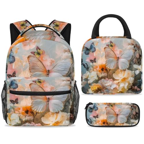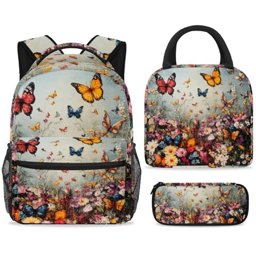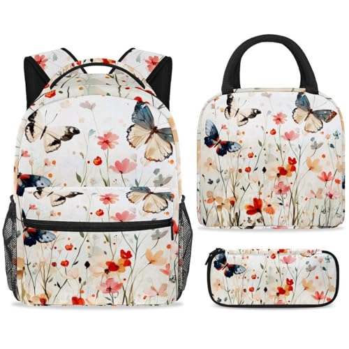 ewndhtse School Backpack Set with Lunch Bag Pencil Case, 3 Pcs School Bookbags Set Travel Rucksack Casual Daypack for Teens Girls Boys Primary Junior Middle - Butterfly Flower