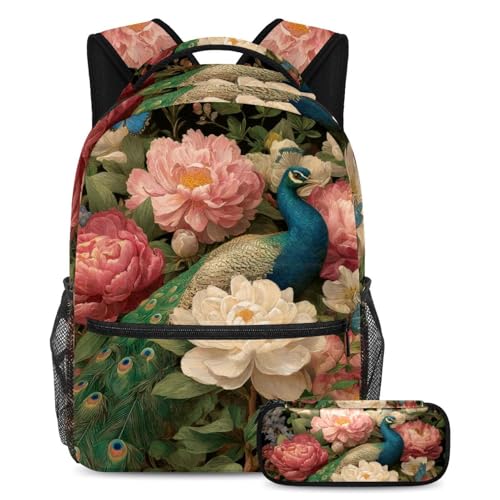 VAPOKF Blossom Peonies Butterfly Peacock School Bag Set for Teen Girls Boys Kids, Student Bookbag Backpack Rucksack with Pencil Case for Primary Secondary Junior High School
