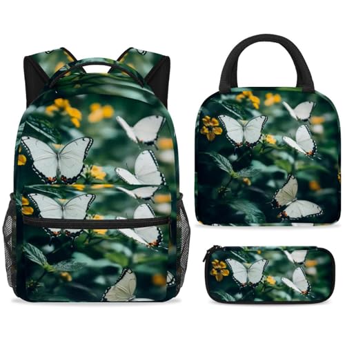 ewndhtse School Backpack Set with Lunch Bag Pencil Case, 3 Pcs School Bookbags Set Travel Rucksack Casual Daypack for Teens Girls Boys Primary Junior Middle - White Butterfly on Green Leave