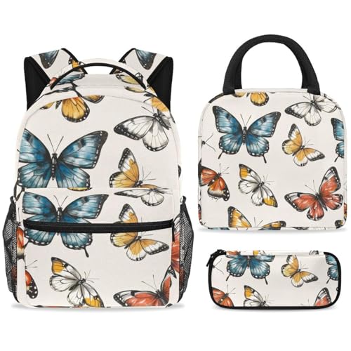 ewndhtse School Backpack Set with Lunch Bag Pencil Case, 3 Pcs School Bookbags Set Travel Rucksack Casual Daypack for Teens Girls Boys Primary Junior Middle - Multicolored Butterfly