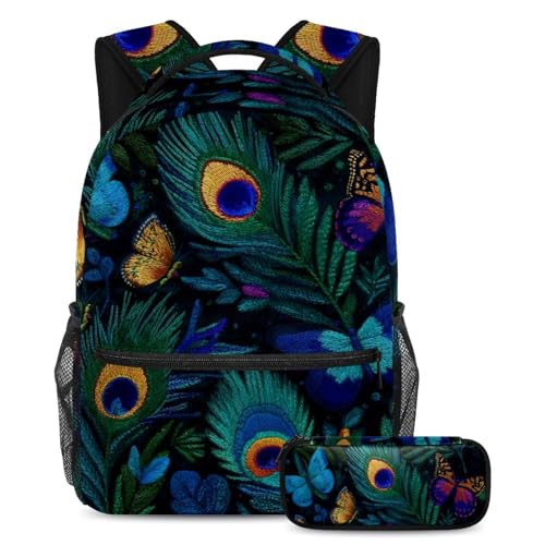 VAPOKF Embroidery Butterfly Peacock Feather Print School Bag Set for Teen Girls Boys Kids, Student Bookbag Backpack Rucksack with Pencil Case for Primary Secondary Junior High School