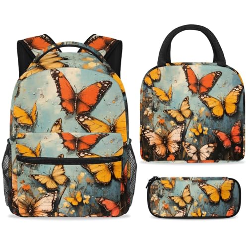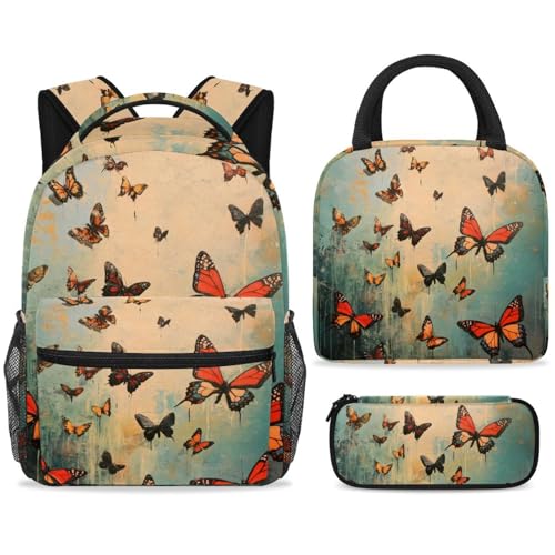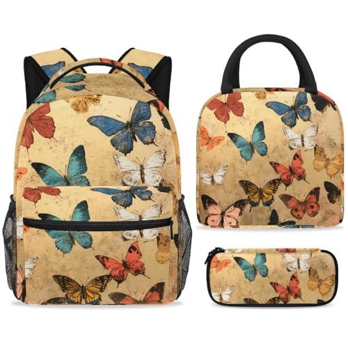 ewndhtse School Backpack Set with Lunch Bag Pencil Case, 3 Pcs School Bookbags Set Travel Rucksack Casual Daypack for Teens Girls Boys Primary Junior Middle - Butterfly on Vintage