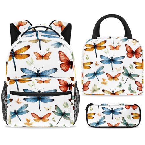 ewndhtse School Backpack Set with Lunch Bag Pencil Case, 3 Pcs School Bookbags Set Travel Rucksack Casual Daypack for Teens Girls Boys Primary Junior Middle - Colorful Dragonflies and Butterfly