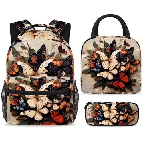 ewndhtse School Backpack Set with Lunch Bag Pencil Case, 3 Pcs School Bookbags Set Travel Rucksack Casual Daypack for Teens Girls Boys Primary Junior Middle - Vintage Butterfly