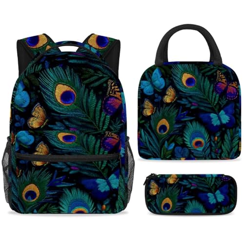 ewndhtse School Backpack Set with Lunch Bag Pencil Case, 3 Pcs School Bookbags Set Travel Rucksack Casual Daypack for Teens Girls Boys Primary Junior Middle - Peacock Feathers Colorful Butterfly