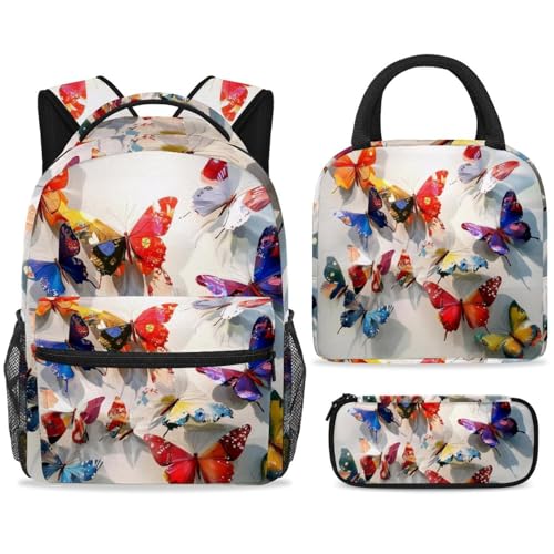 ewndhtse School Backpack Set with Lunch Bag Pencil Case, 3 Pcs School Bookbags Set Travel Rucksack Casual Daypack for Teens Girls Boys Primary Junior Middle - Colorful Butterfly