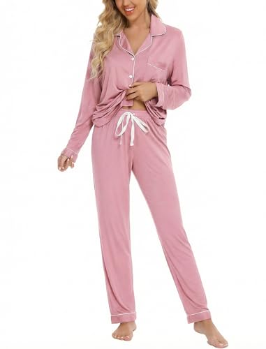 Leikar Button Up Pajama Set For Women Long Sleeve Shirt And Pajama Pants Soft Pjs Lounge Sets, Bean Paste, M