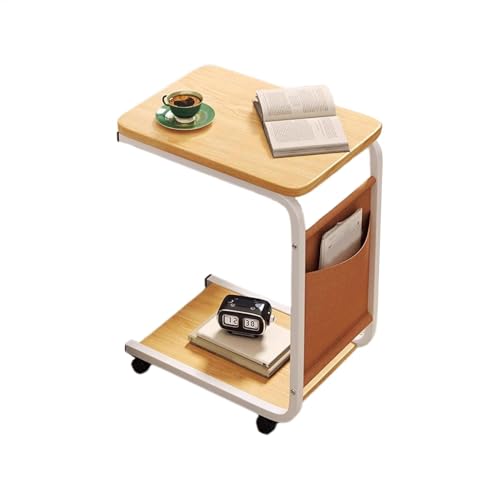 C-Shape Side Table, Mobile Under Sofa Tables for Living Room, Space Saving End Table with Storage Bag & Wheels, Laptop Desk Snack Table for Home Office Bedroom, Rolling Bedside Tables (Maple Color)