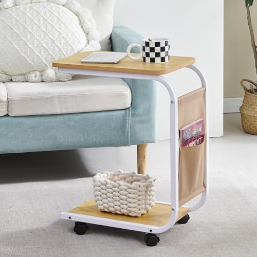 NKQHRTDE C Shape End Table, Sofa Tray with Couch on Wheels and Storage Bag, Side Table for Living Room, Bedroom and Office