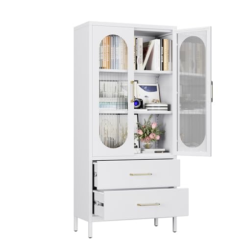 Aobabo Metal Office Files Storage Cabinet with 2 Drawers and 2 Adjustable Shelves - 155cm High Glass Doors White Storage Cabinet,3-Tier Tall Steel Cabinets for,Living Room,Office,Assembly Required