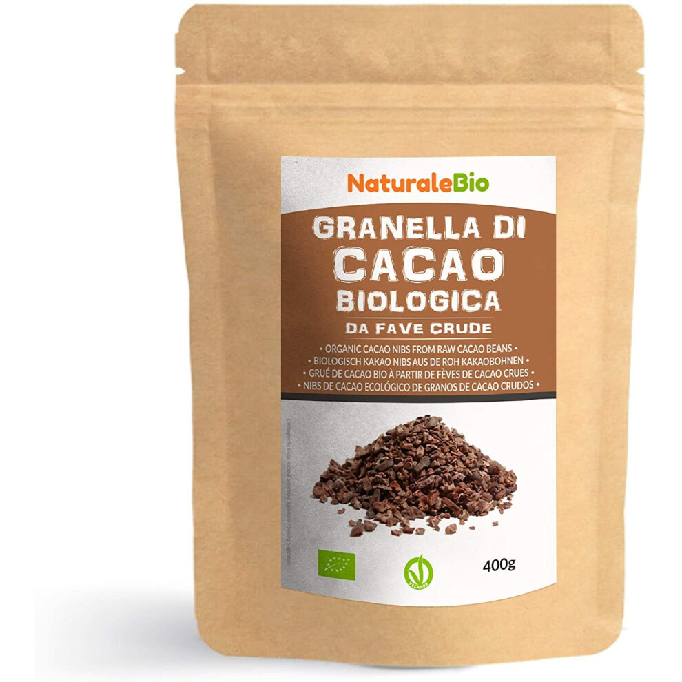 NaturaleBio Organic Raw Cacao Nibs 400g. Natural and Pure. Made in Tropical Regions from The Theobroma Cacao Plant. Source of Magnesium, Potassium and Iron.