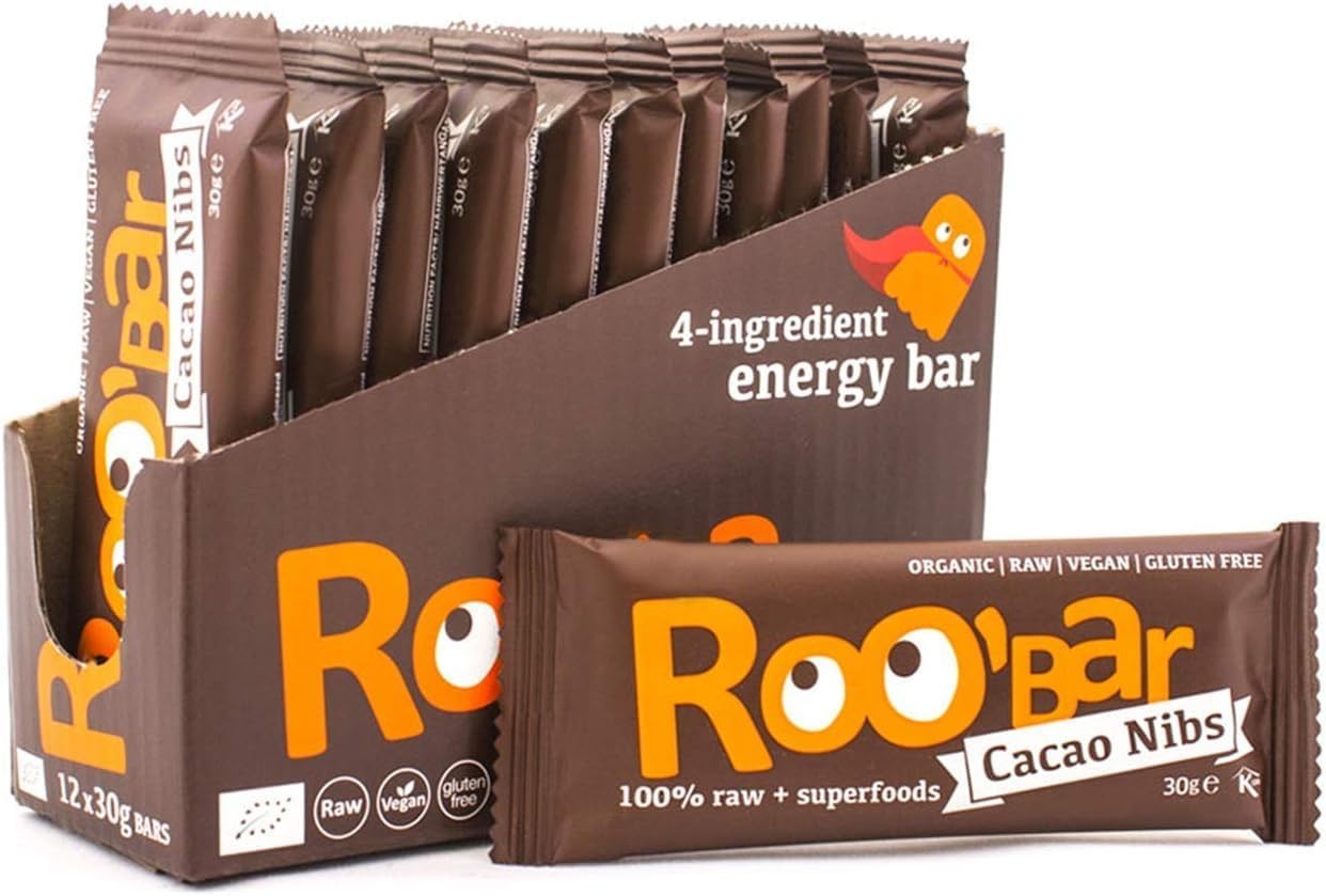 Roobar Cacao Nibs Raw Bar - Dairy & Gluten Free. 100% Organic, Vegan with Superfoods. No Added Refined Sugar - 12 x 30g Raw Bars