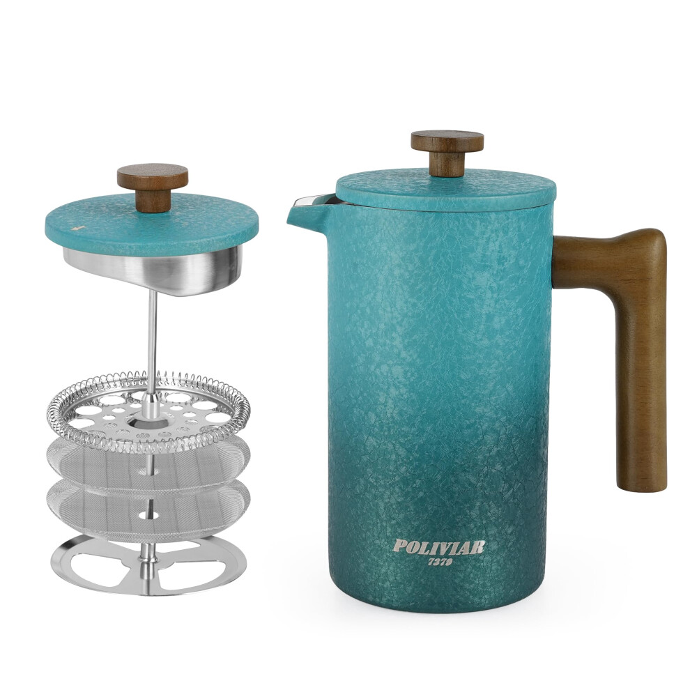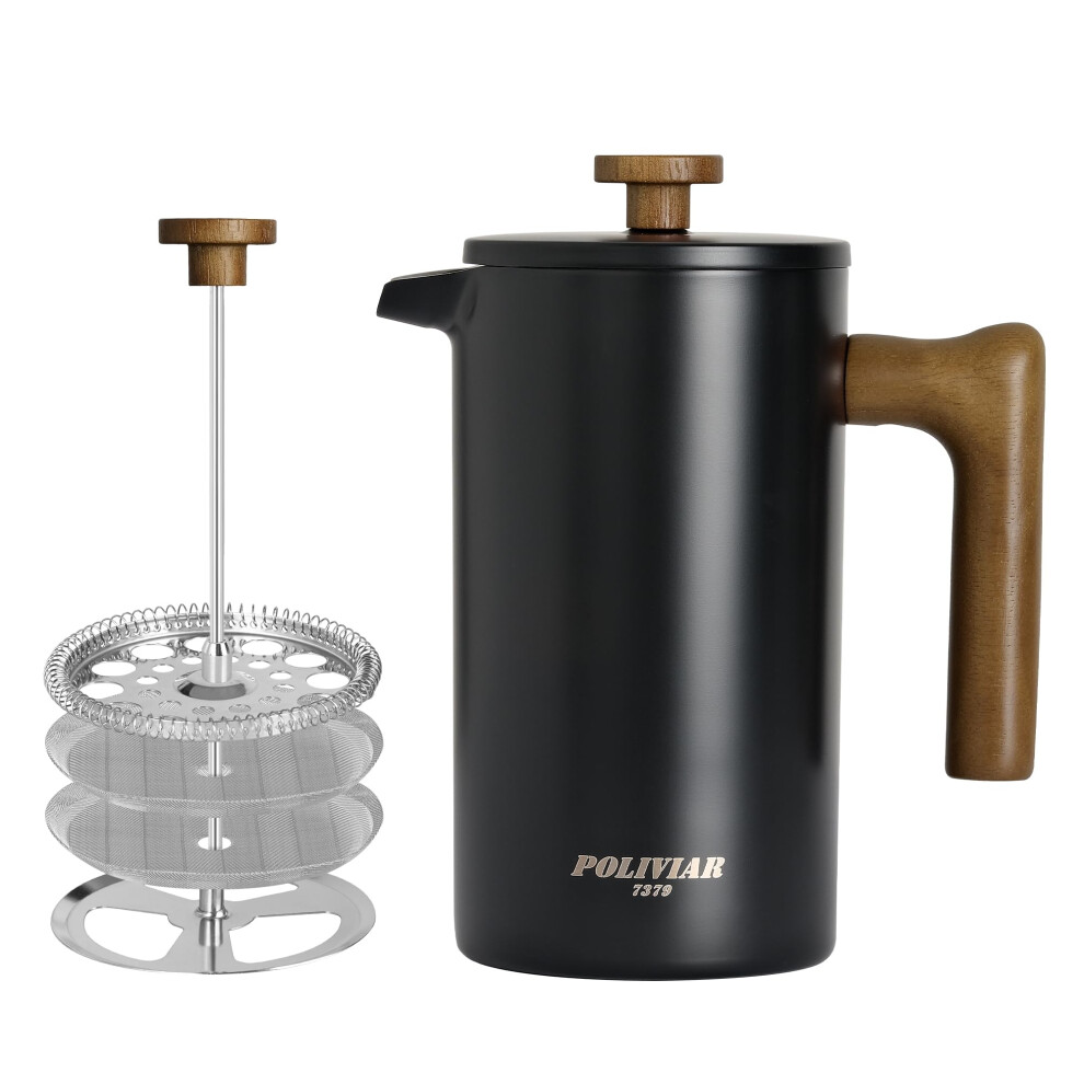 POLIVIAR Cafetiere 8 Cup, French Press Coffee Maker with Wood Handle, Double Walled Insulated Cafetiere &1 Extra Filter, Insulated 1L French Press for Coffee & Tea, Includes 1 Extra Filter