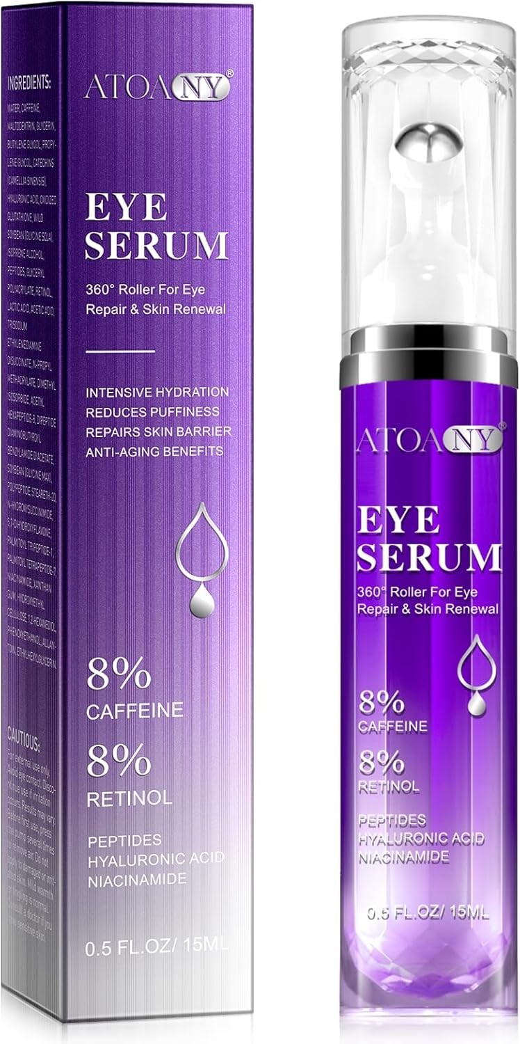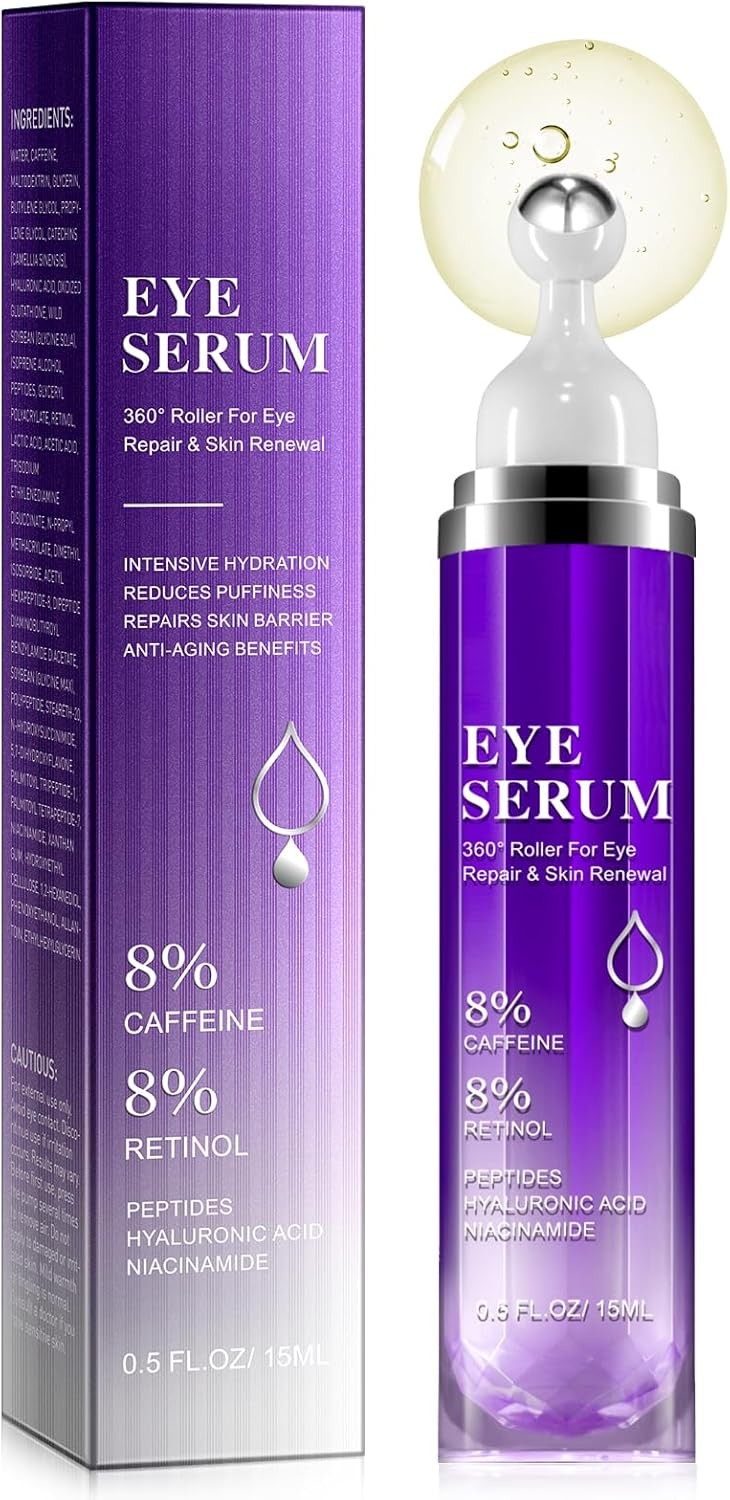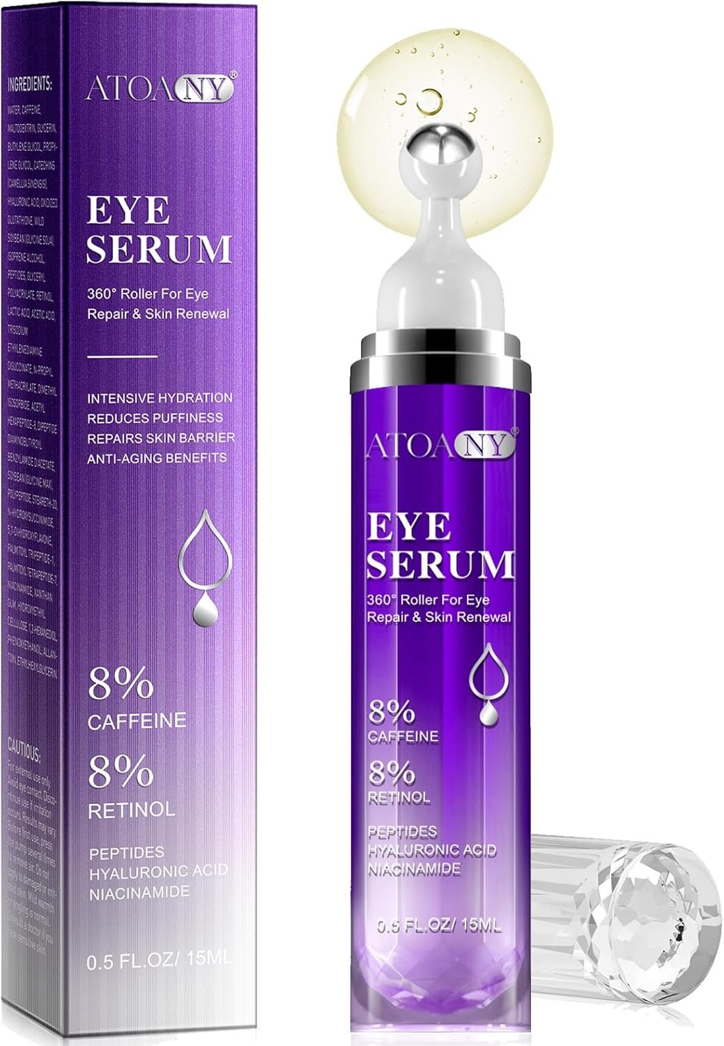 Eye Serum for Dark Circles and Puffiness with 8% Caffeine 8% Retinol Hyaluronic Acid Niacinamide, Under Eye Cream Anti Aging for Puffiness and Bags with 360° Eye Roller Ball for Women & Men