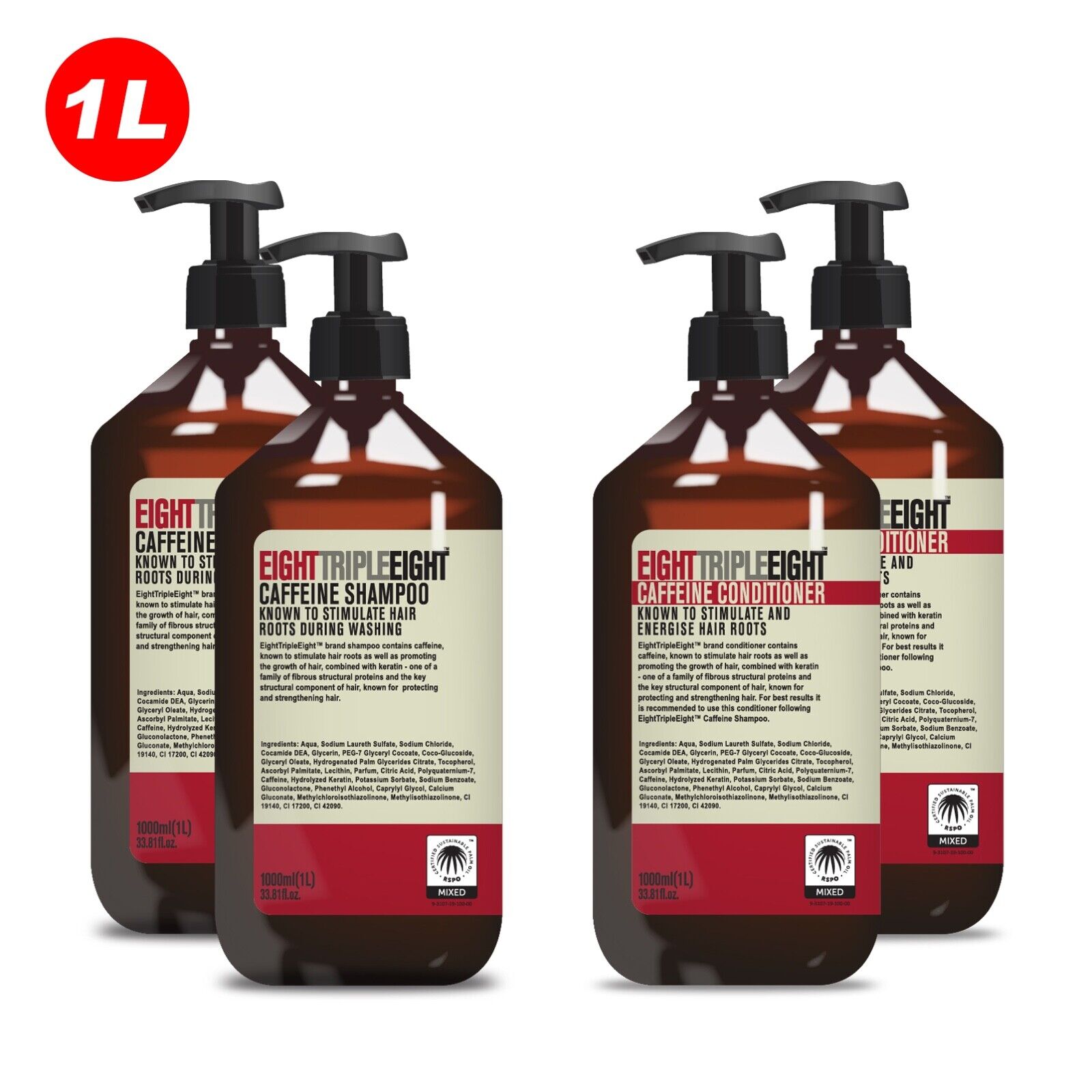 EightTripleEight Caffeine 2x Shampoo & 2x Conditioner 1L