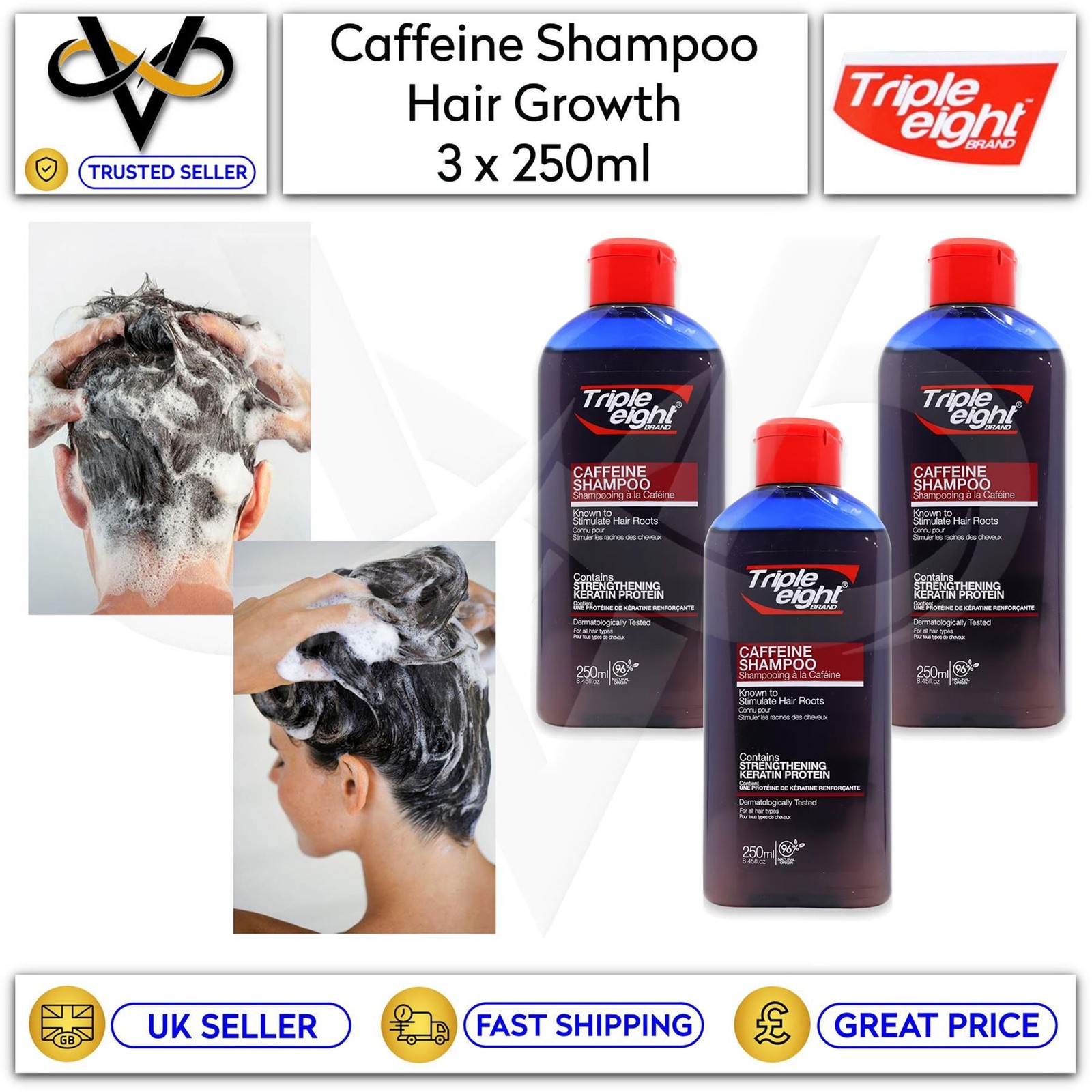 3 x Triple Eight Caffeine Shampoo 250ml Keratin Protein Hair Growth Men/Women