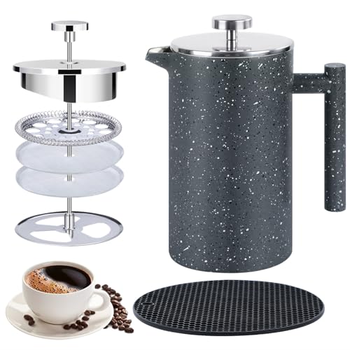 KOOYAT Cafetiere French Press Coffee Maker with Capacity of 1000ml / 8 Cup Double Walled Insulated Coffee Press for Ground Coffee at Home Travel Large Caffettiera Gift Set for Woman Man Marble Color