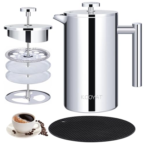KOOYAT Cafetiere French Press Coffee Maker with Capacity of 1000ml / 8 Cup Double Walled Insulated Coffee Press for Ground Coffee at Home Travel Large Caffettiera Gift Set for Woman Man Silver Color