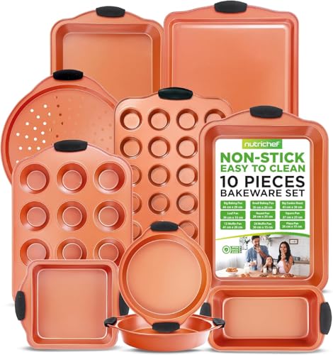 NutriChef 10-Piece Non-Stick Baking Pans Set - Premium Nonstick Carbon Steel Oven Bakeware - Includes Cookie Sheets, Muffin & Cake Pans, Pizza Crisper, Roasting Pans, w/Silicone Handles - Copper