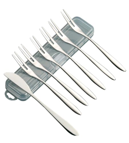NestNook Two Tine Dessert Fork Set of 6 Cake Forks and 1 Cake Knife Stainless Steel Tea Forks Silver Pastry Forks 13 CM(5.12 Inch) Small Forks for Cake Appetizer Fruit