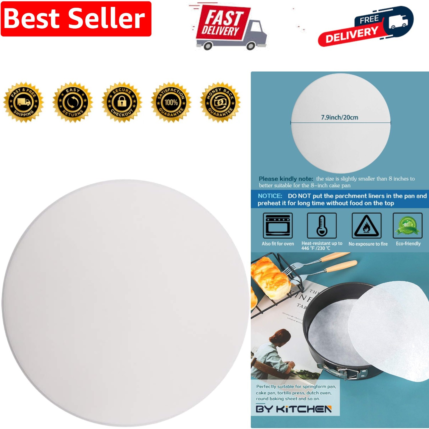 8 Inch Baking Parchment Circles, Set of 100, 7/9/10/12inch Cake Tin Liners Available, Round Parchment Papers for Springform Cake Tin, Pizza Maker, Tortilla Press and More