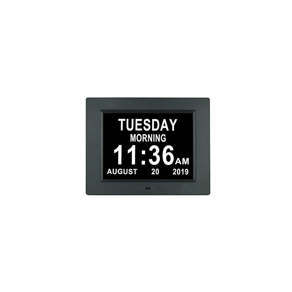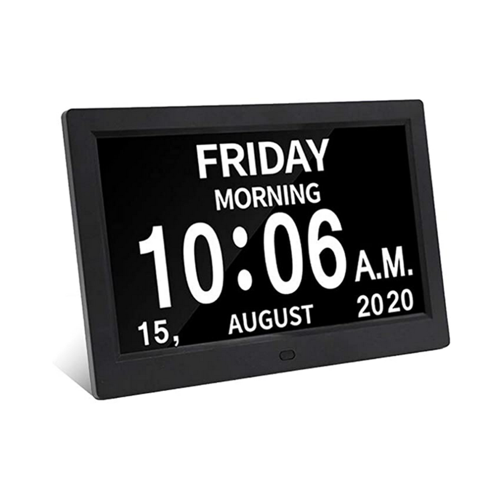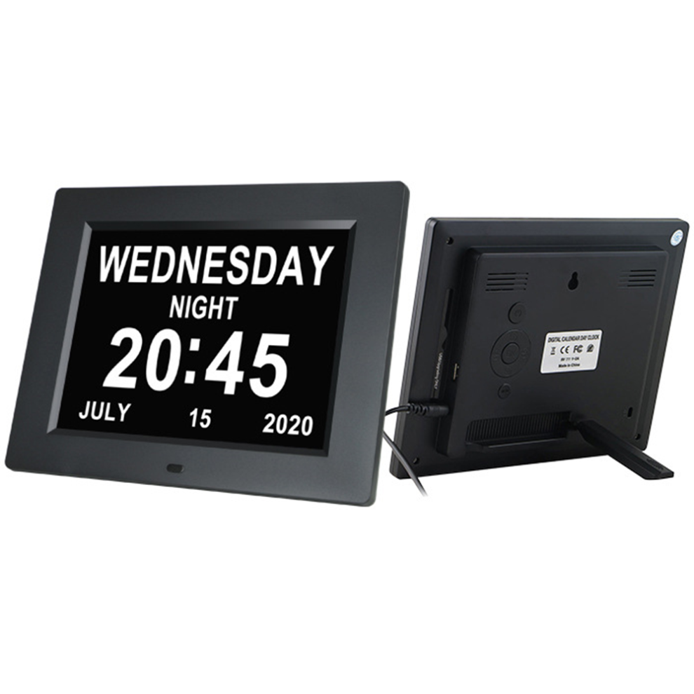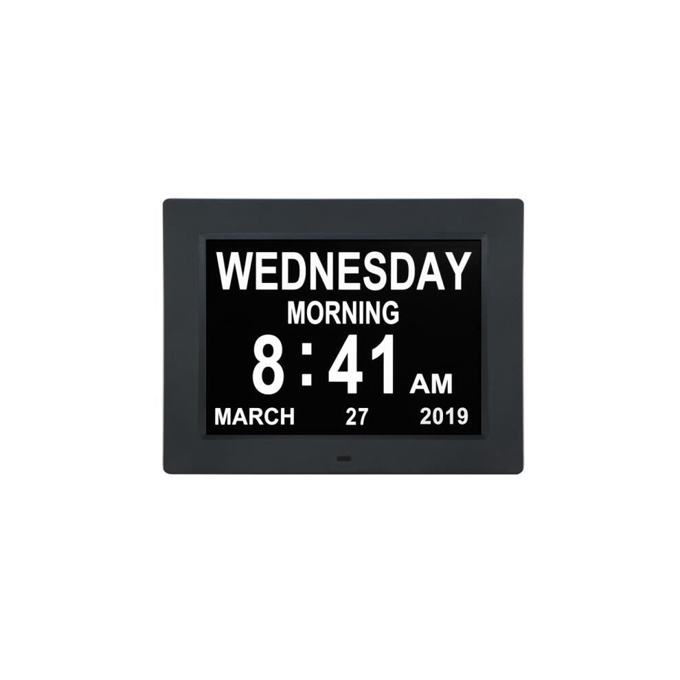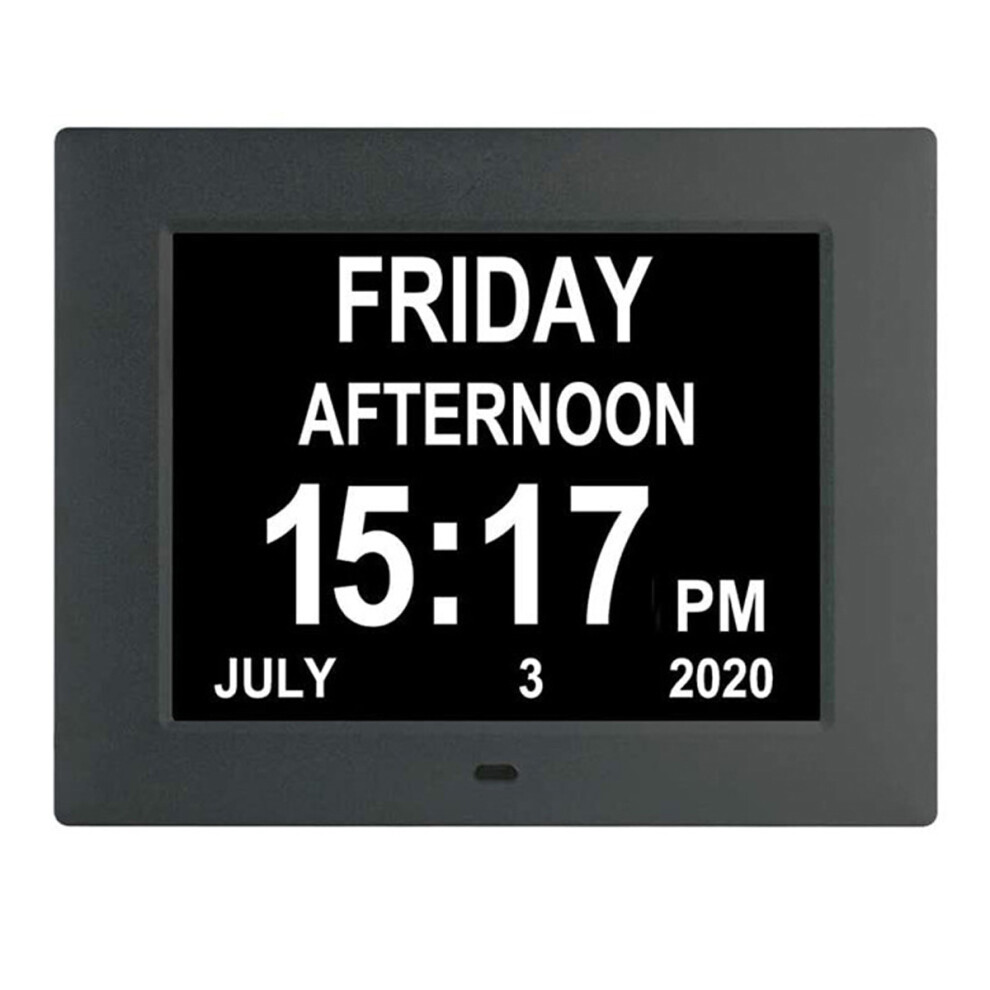 Digital Calendar Alarm Clock for Seniors, 8 Inch Easy To Read Display with Battery Backup and Supports Multiple Languages (Black)