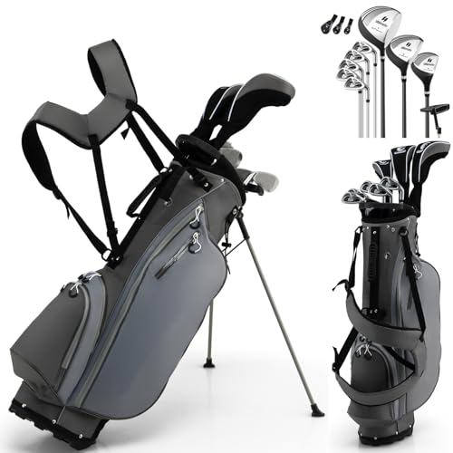 GYMAX Golf Club Set, Complete Right Handed Golf Clubs Set with 460cc Alloy Driver, 3# Fairway Wood, 4# Hybrid, 6#, 7#, 8#, 9# & P# Irons, Free Putter and Stand Bag, Adult Golf Package Sets (Gray)