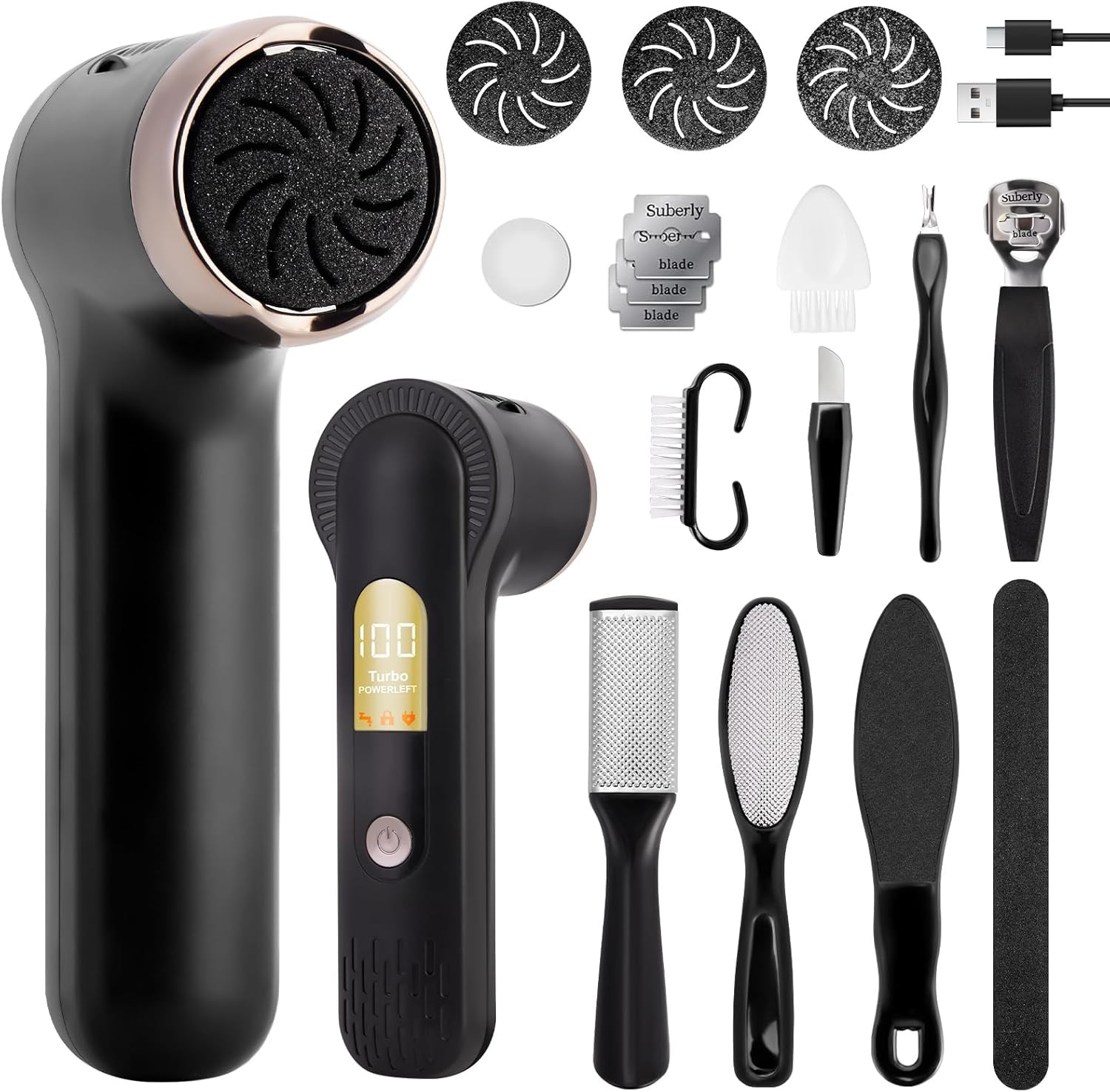 PKBD Electric Foot File Hard Skin Remover with 2 Replaceable Double Grinding Heads, Pedicure Sets for Feet with 14 Accessories, Rechargeable Waterproof Callus Remover for Feet Care Exfoliator