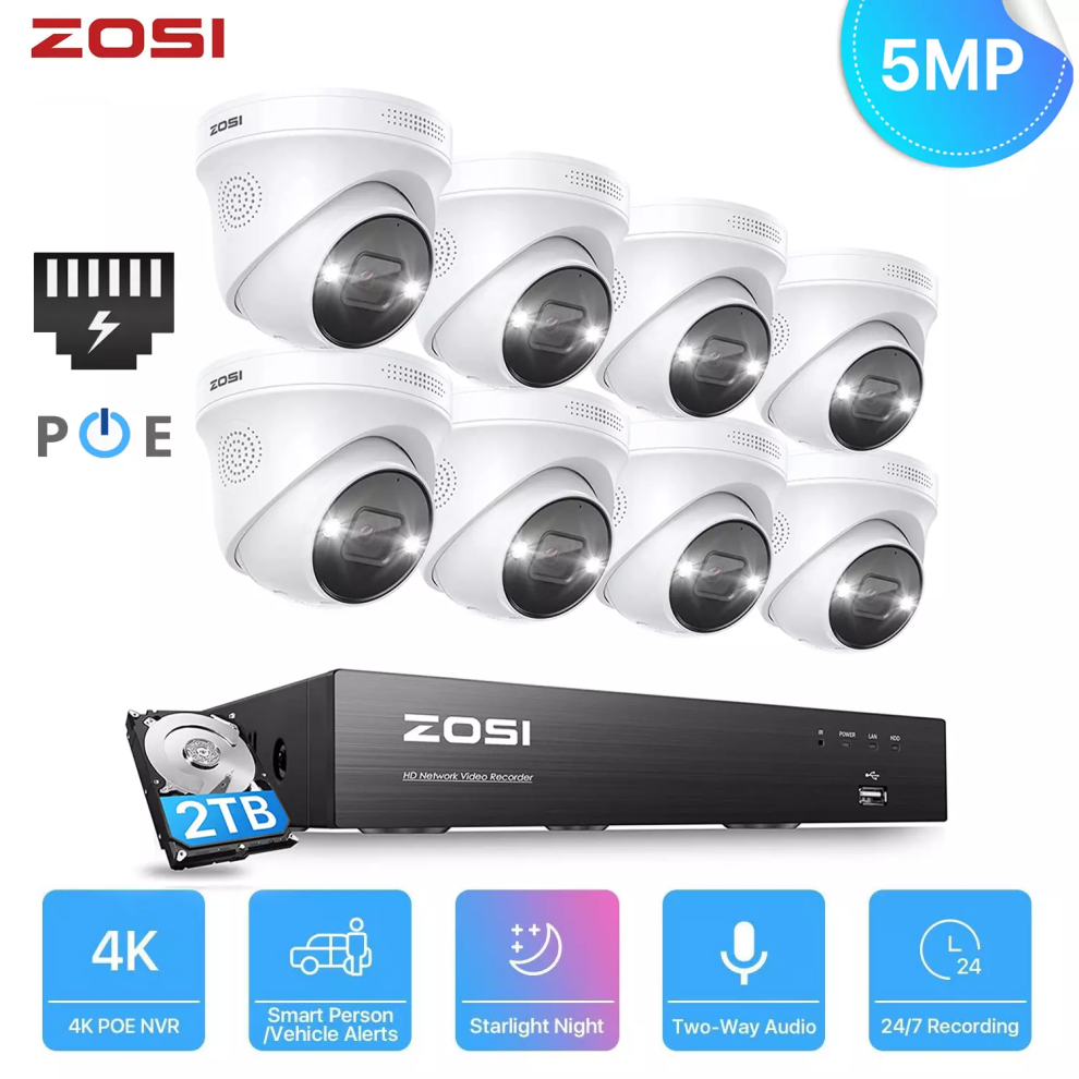 ZOSI 5MP POE CCTV Camera Security System Outdoor 4K NVR 2TB ColorVu