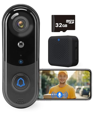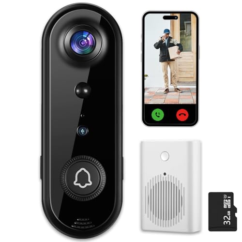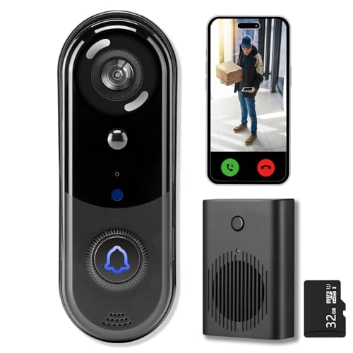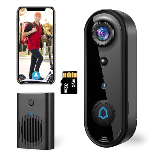 1080P Video Doorbell Camera with 32 GB SD Card, Wireless Doorbell Camera Outdoor, No Monthly Fee, indoor chime, 2.4G WiFi, IP65 Waterproof, Night Vision, Ai Human Detection, SD Card/Cloud Storage (J1)