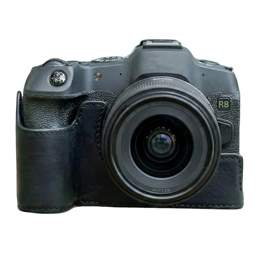 Camera Half Case Compatible with Canon EOS R8 Genuine Leather Protective Bottom Cover with Hand Grip Opening Bottom Design for Easy Battery Access Built-in 1/4" Tripod Thread Retro Style Black
