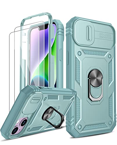 LeYi for iPhone 14 6.1'' Case with Camera Cover Slider, 360° Full Body Armour Military Protective Shockproof Phone Cover | 2 Pack Tempered Glass Screen Protector | Ring Stand Holder | Green