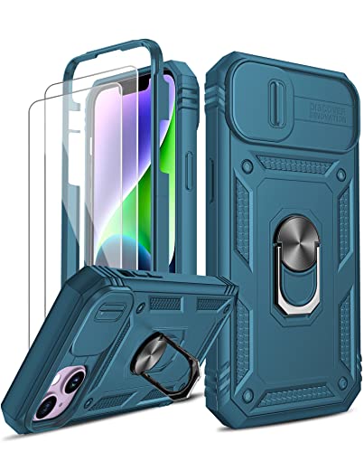 LeYi for iPhone 14 6.1'' Case with Camera Cover Slider, 360° Full Body Armour Military Protective Shockproof Phone Cover | 2 Pack Tempered Glass Screen Protector | Ring Stand Holder | Blue