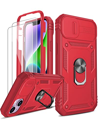 LeYi for iPhone 14 6.1'' Case with Camera Cover Slider, 360° Full Body Armour Military Protective Shockproof Phone Cover | 2 Pack Tempered Glass Screen Protector | Ring Stand Holder | Red