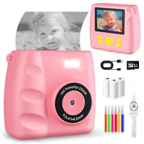 HiMont Kids Camera Instant Print, Digital Camera for Kids with No Ink Print Paper & 32G TF Card, Selfie Video Camera with Color Pens for DIY, Fun Gift for Girls Boys 3-14 Years Old (Pink)