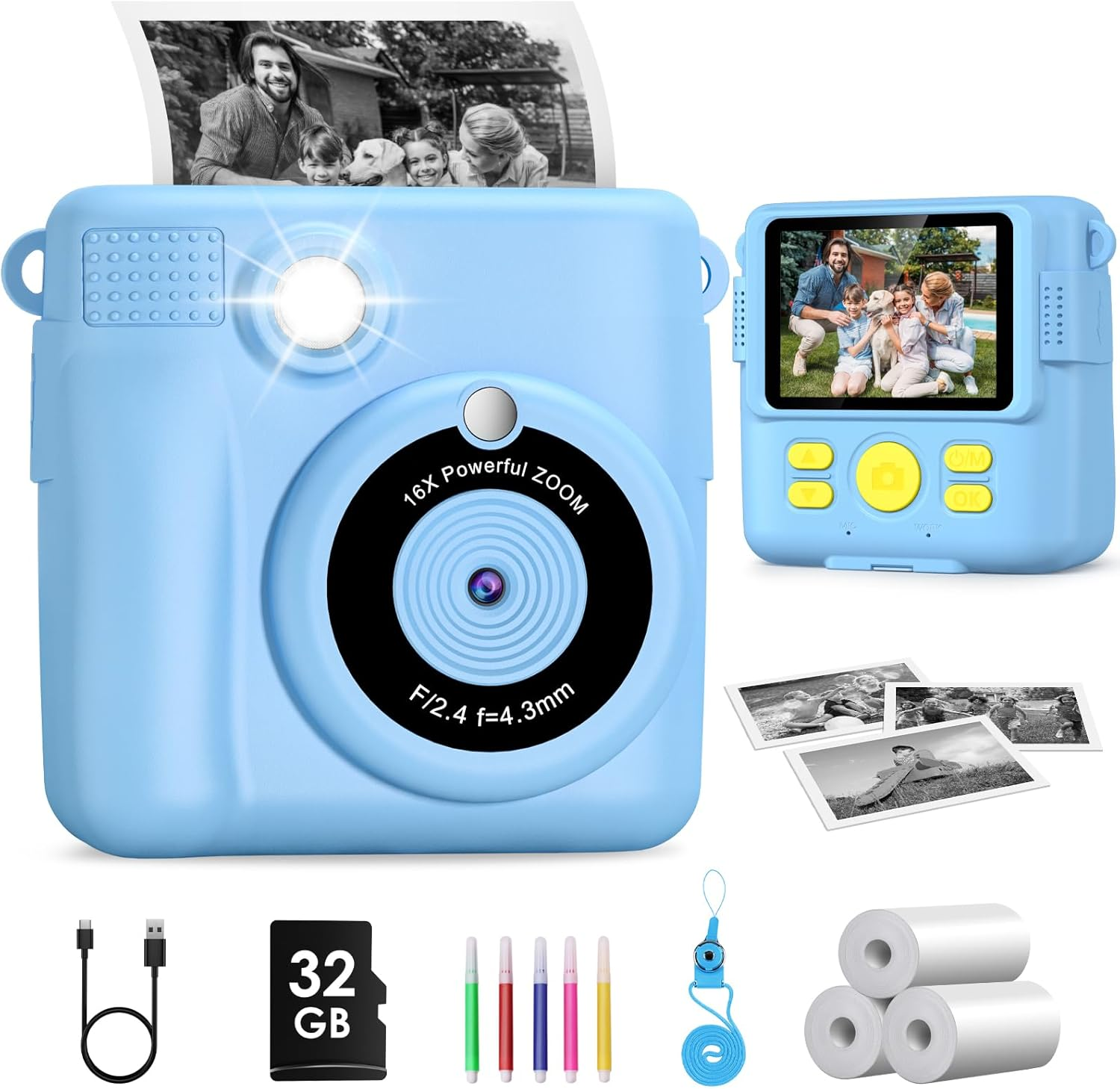 CAMCLID Kids Camera Instant Print, 3,0 Inch/48MP Instant Camera for Kids, 2.5K UHD Digital Video with 32GB Card, Christmas Birthday Toy Gifts for Girls Boys 3 4 5 6 7 8 9 10 Years Old (Blue)