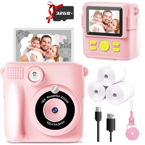 Kids Camera Instant Print, Instant Camera with 1080P Videos,Selfie instant print camera with 3 Rolls Print Paper & 32GB SD Cards, Christmas Birthday Gifts for Girls Age 3-12 (Pink)