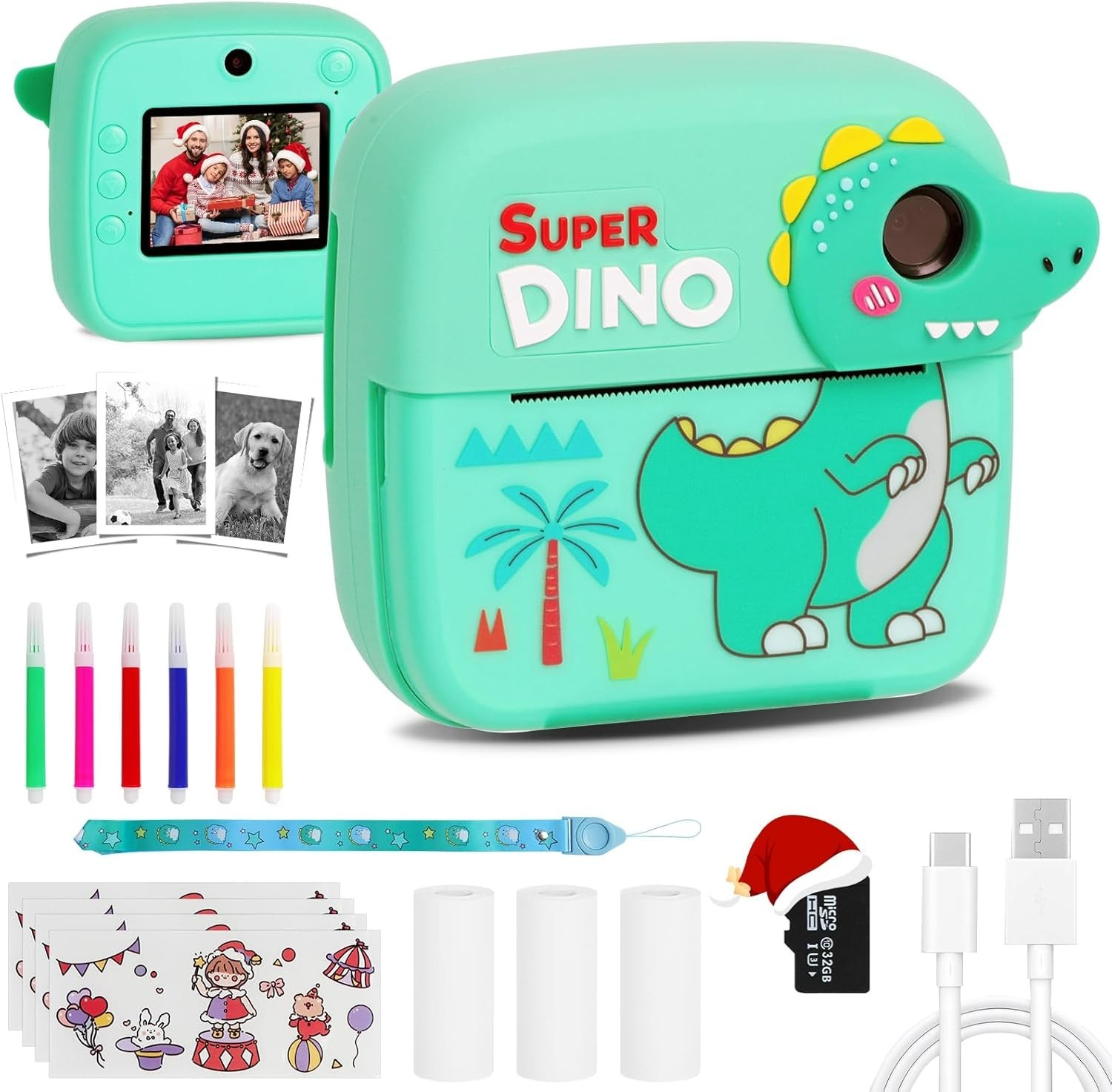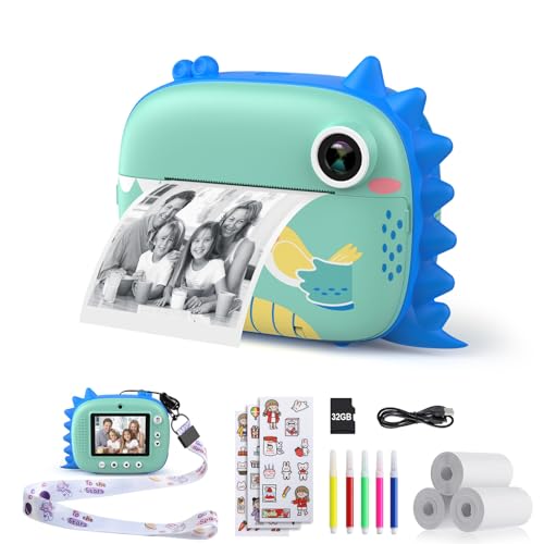 Kids Camera Instant Print, CAMCLID 2.4 Inch Screen Camera for Kids Dinosaur Children Digital Toys with 32GB Card & 3 Rolls Paper, Christmas Birthday Gift for Boys Girls 3-12 Age(Green)
