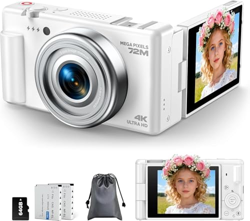 Digital Camera 4K, 72MP Autofocus Vlogging Camera for YouTube with 18X Digital Zoom, 2.8" 270°Flip Screen Compact Travel Cameras with 64GB Card & Battery for Teens Beginners Photography