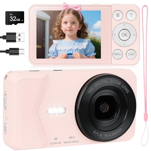 4K Digital Camera - 64MP 2.8" UHD Compact Cameras - Autofocus Rechargeable Vlogging Camera with 32G SD Card Portable Travel Mini Small Camera with 18X Digital Zoom for Kids Beginners Teenagers (Pink)