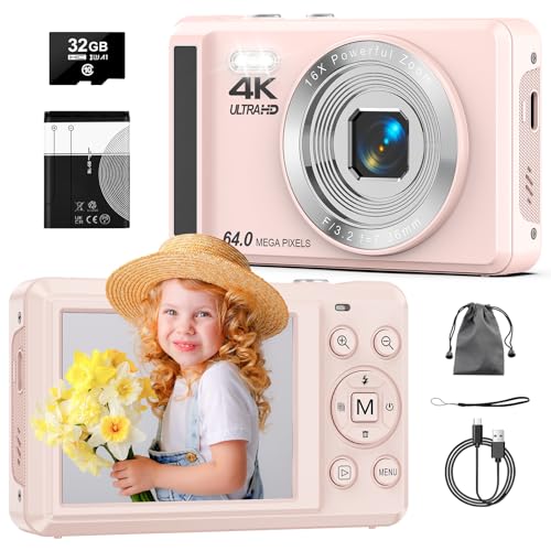 Digital Camera 4K 64MP Autofocus Cameras with 32GB Card, 16X Digital Zoom Compact Digital Camera with 1200 mAh Battery for Kids Beginners Teenagers