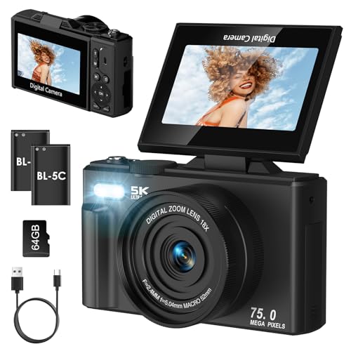 Digital Camera, LAMA 5K 75MP Autofocus Vlogging Camera with 64G SD Card, Compact Camera with 3.0 Inch 180° Flip Screen, 18X Digital Zoom Cameras for Kids, Teenagers, Beginners, Adults Black