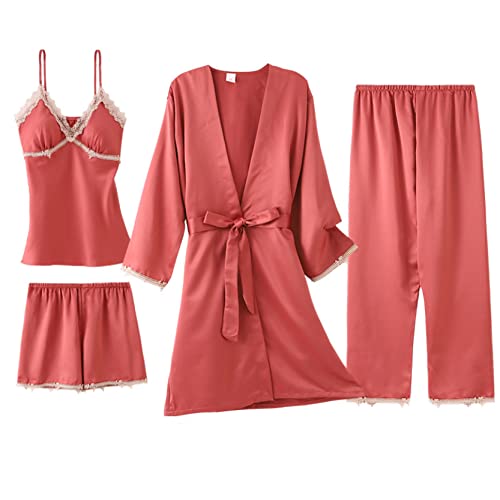SLOPSS Loungewear For Women Cami And Pants Long Sleeve Sleepwear 4 Piece Pajama Silk Satin Fall Winter Nighties Brick Rood-l