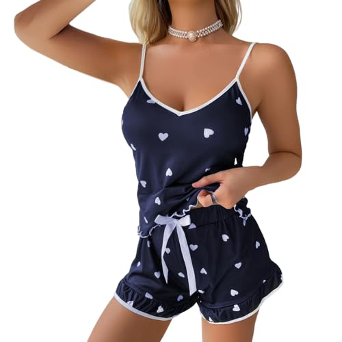 Sexy outfit Women's Ice Silk Y2K 2 Pieces Outfit Sexy Summer Pj Sets Sleeveless Heart Print Cami Tops High Waist Shorts Cute Pajama Suit Sling Tank Top Streetwear Clothes Set Sleepwear Loungewear,S-XL